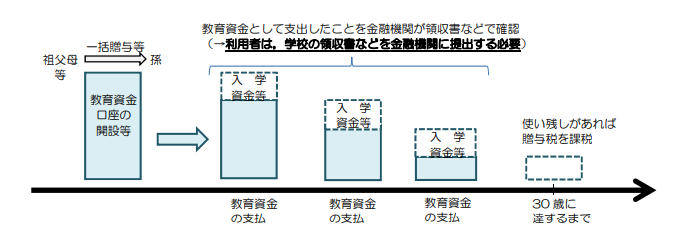 贈与者である祖父母等が、受贈者である孫に資金を贈与した後、孫はすぐに自由に教育資金を使えるというものではありません。金融機関で提供する教育資金贈与信託スキームを利用した手続きとなります。
